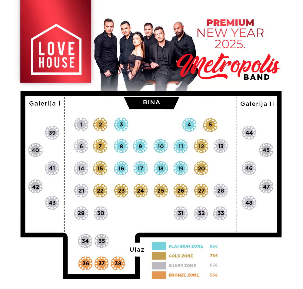 Uz sve to, Love House Event Hall pruža različite zone sedenja, od Bronze do Platinum, kako biste uživali u najboljoj atmosferi. Proslavite ulazak u 2025. godinu u ambijentu koji spaja luksuz, vrhunski provod i nezaboravne trenutke. Rezervišite svoje mesto i postanite deo ovog jedinstvenog događaja.