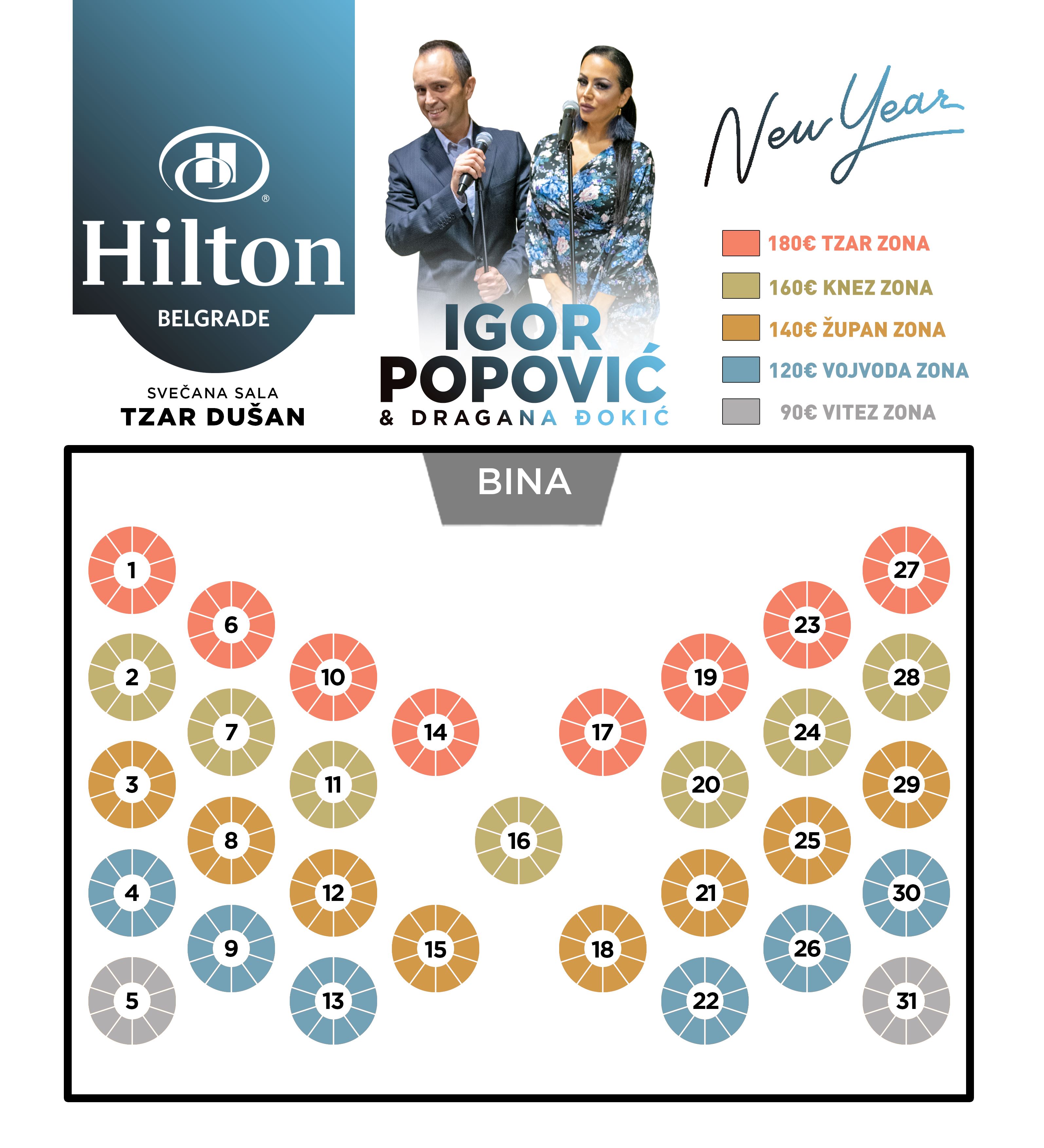 Za muzički program zaduženi su talentovani Igor Popović i Dragana Đokić, čiji nastupi garantiraju nezaboravan provod. Sa sjajnim repertoarom, ovi izvođači unose posebnu energiju u svaku pesmu, čineći ovu noć nezaboravnom. Pored vrhunskog provoda, Hilton Hotel Beograd nudi specijalne popuste za goste koji žele da uživaju u luksuznom smeštaju tokom prazničnog vikenda